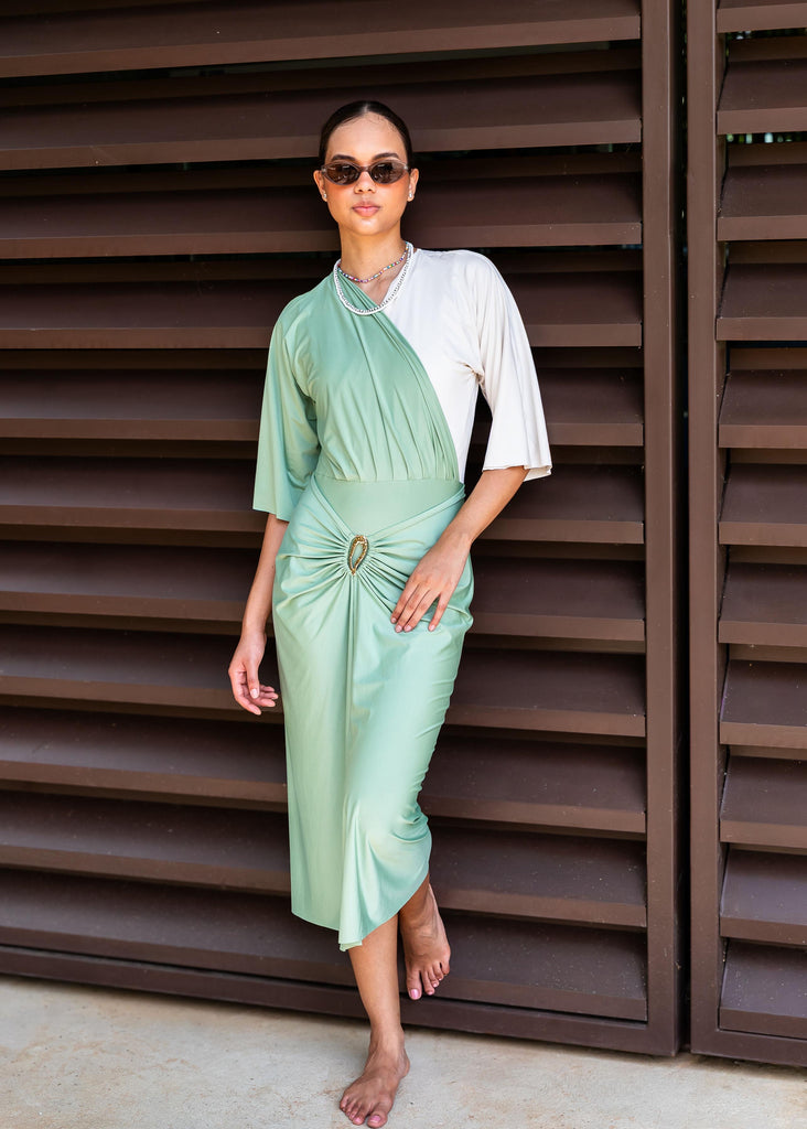 MODERNISIMO BLUE : Elegance in motion. Our newest silhouette features a draped, cross-front design in bold two-tone hues, finished with a sleek Lycra skirt and statement buckle. Modern glamour, made for the water."