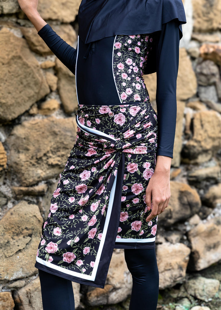 The ROSE modest swimwear set is the perfect blend of style, comfort, and functionality for those seeking more coverage without sacrificing fashion. This chic black swimwear features a long-sleeve top with a front zipper, built-in support with bra cups, and a flattering fit designed to offer extra security.