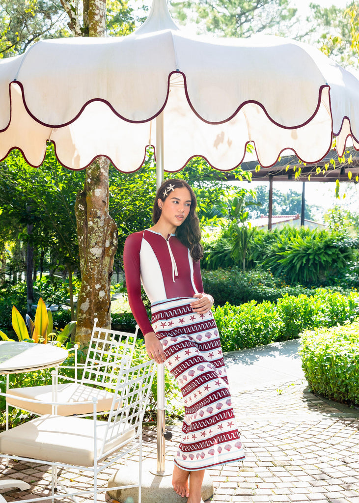 Paired with a midi skirt crafted from quick-dry, swim-proof material, this set ensures you can go from the water to dry land in minutes. ThThe swim top includes solar guard technology, offering excellent protection from the sun’s harmful rays.